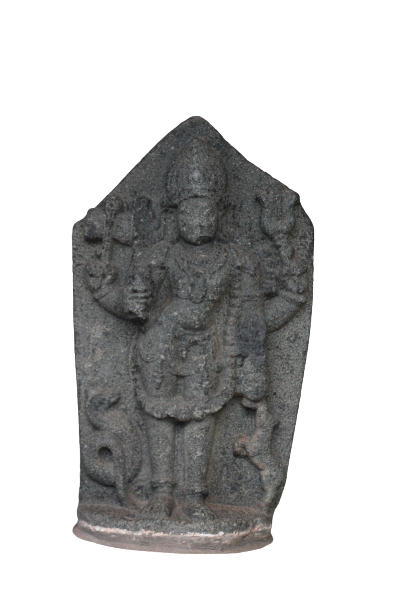 A four armed Bhairava in abhanga posture holding possibly khadga (sword) in right lower hand which is chipped off, damaru (drum) in right upper hand, trisula (trident) in the left upper hand. The dog (Svan) carved on the left jamb of the prabhavali is depicted as sniffing the head hung to the left front hand of the deity. Below the right end of the deity, a Naga has been depicted in an uplifted position. The deity wears various hara (necklaces) including mundamala (garland made of skulls) and he wears jatabhara (matted hair). The figure is very much weathered and worn out.