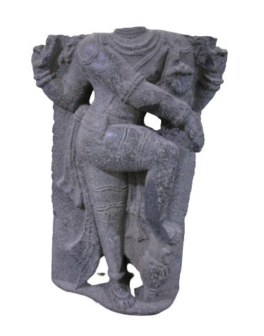 Fragment of four armed Dwarapalaka standing in profile. The lower right hand is in danda hasta mudra on the shaft of the mace which is firmly placed on the pedestal. The left lower hand is in suchi mudra. The right leg is in ardhasam posture. The head and the two back hands are broken. The sculpture is well ornamented with haras (necklace), kankana (bracelets), keyura (armlets), upavita (sacred thread), katibandha (waistband), nupur (anklets).