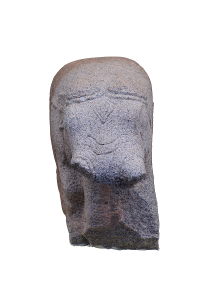 A balustrade with Elephant decorated with caparison and trappings around the body. Two round cap-like decorations are also visible over the head of the elephant. The trunk is broken and has majorly worn out.