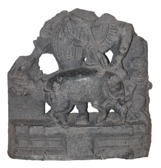 Sculpture of Mahishasuramardini. The Devi is seen subduing the buffalo, with her left foot on the neck of the buffalo. Her right leg stands firm on the ground. Her lion vahana (vehicle) is depicted on the left and Mahishasura as coming out of the buffalo on the right. The parts above the waist of the Goddess including all hands are broken.