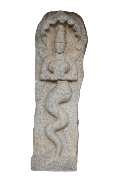 A granite sculpture representing an anthropomorphic seven hooded Female Naga (Nagastree) standing and hands held in anjali mudra. She is carrying a miniature naga in each of her arms. She adorned with haras, jatamukuta, chakrakundala, katibandha and armlets.