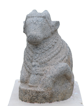 A couchant Nandi decorated with three row chain of bells around the neck. An ornamental band on the forehead and a decorative strap encircles the body in order to secure a saddle on its back.