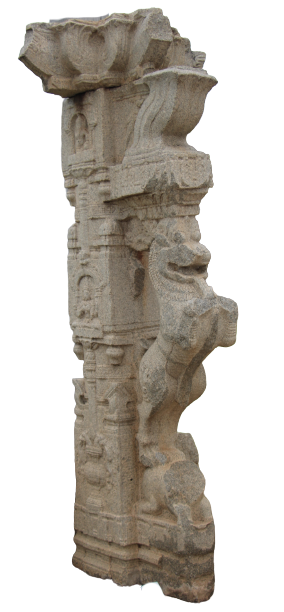 A granite pillar from the shaft of which is depicted beautiful ornamental bracket in the form of a colossal and furious looking lion or a hippogryph rearing over an elephant. Both the pillar and the projecting vyala which is in round are carved out of a single block of stone. The front paws of the vyala, its tail and the body of the elephant below is all broken. The main pillar has three sides. The lower panel has a ghata pallava motif, a Venugopala, again a ghata pallava motif. The middle panel has depiction of Krishna and Vishnu. The topmost panel has possibly Krishna, Vitthala and ascetic in atibhanga posture.