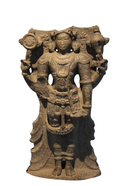 A standing figure of four armed Venkatesha. The upper right and left hands hold chakra (discus) and shankha (conch) respectively. The lower left hand is held in kati hasta mudra and the lower right hand is broken. The deity is profusely ornamented. The crown and parts above are lost. Face is chipped.